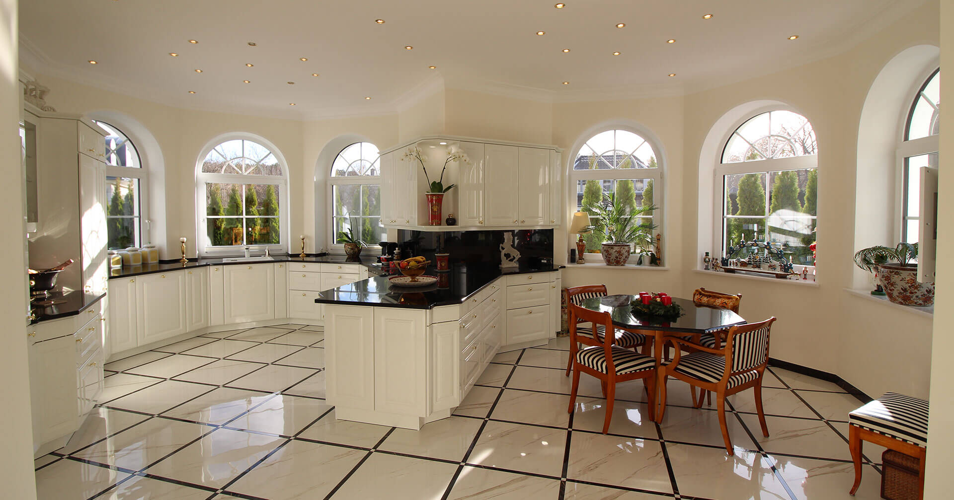 runden Fenstern, einer Insel zum Anrichten und großzügigem Küchen-Essplatz für die ganze Familie.