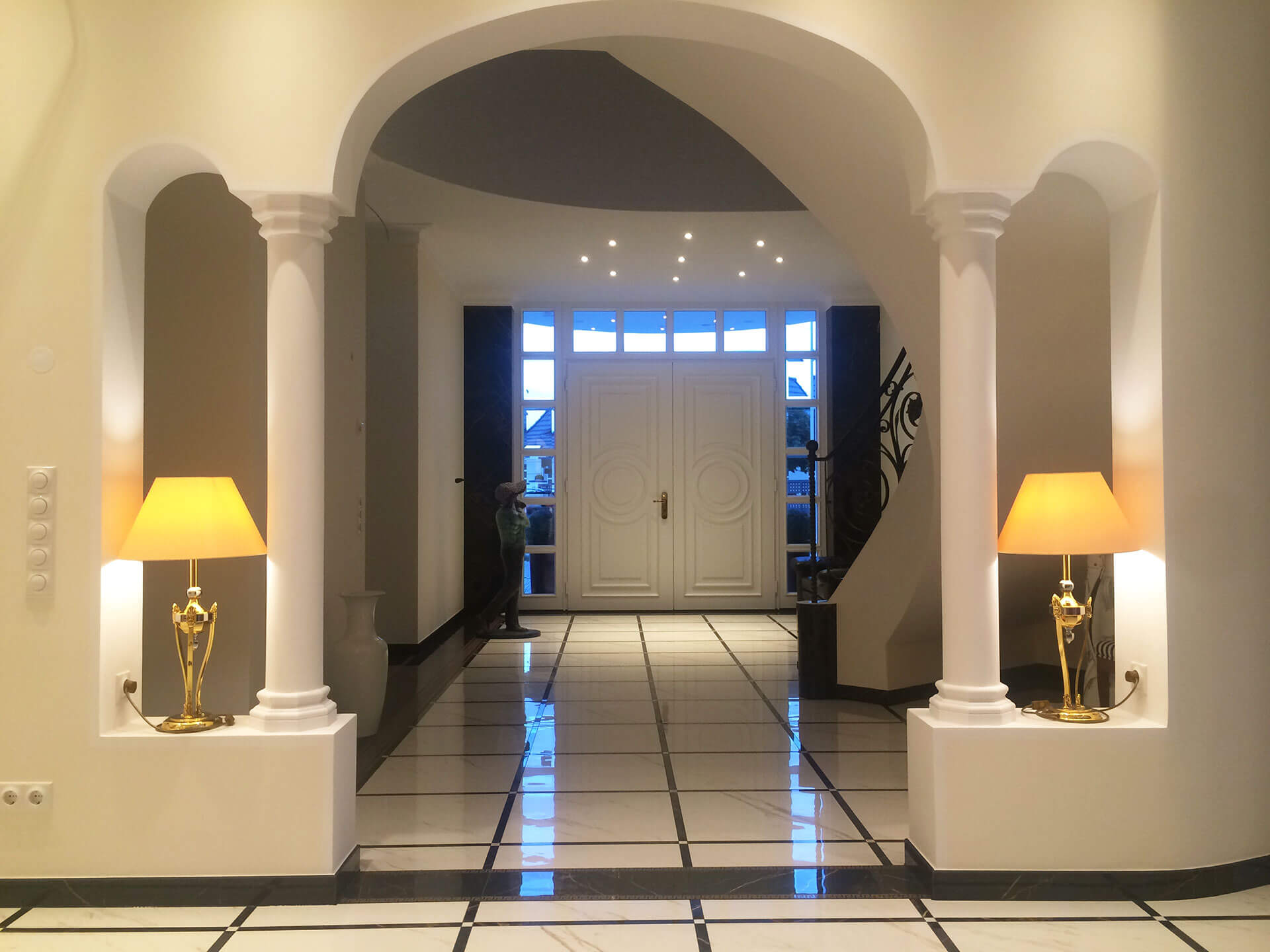 Die harmonisch geschwungene Treppe und der leicht maurisch anmutende, dreifache Bogen-Durchgang und die gestaltete Deckenbeleuchtung runden das Bild dieser exklusiven Stadtvilla individuell und harmonisch ab.