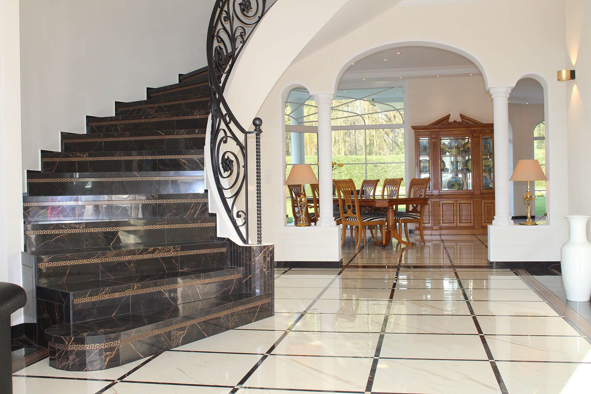 Die Berliner STADTVILLA innen : Die elegant geschwungene, schwarz-gold marmorierte VERSACE-Treppe mit dem, individuell