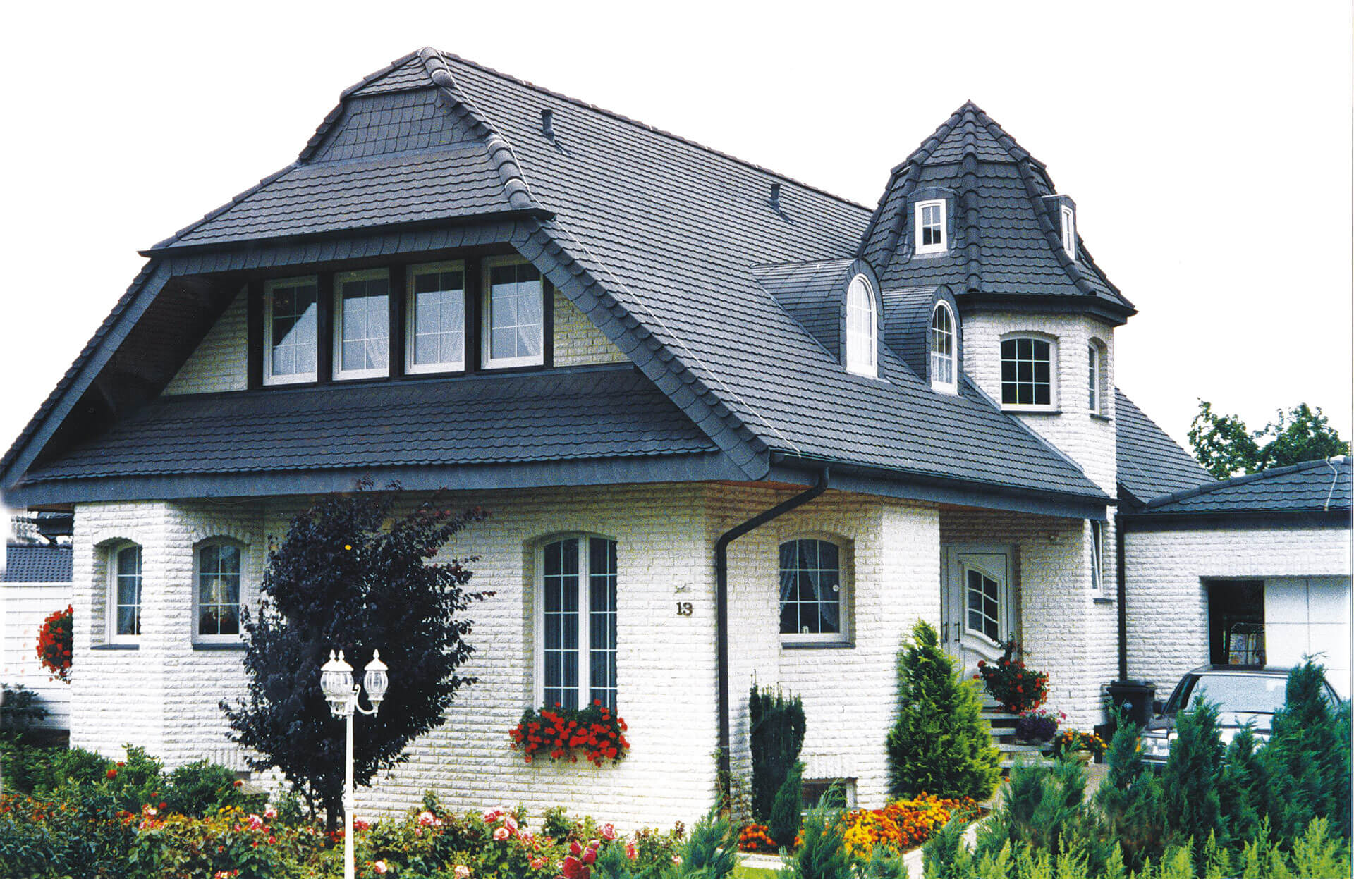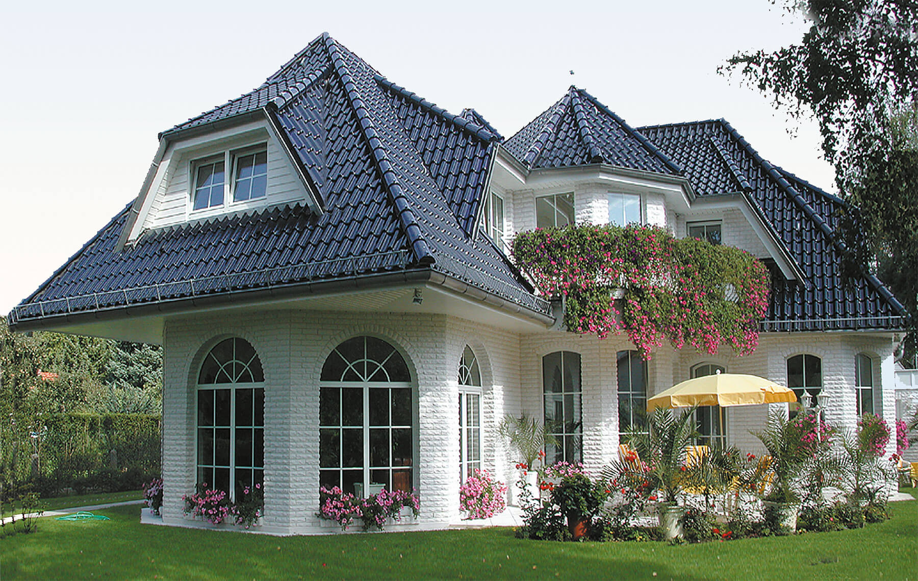 Ein weißes Klinker-Haus mit traditionell-zeitlosem Walmdach aus dunkelblauen, höchstwertigen Meyer-Holsen-Hohlfalzziegel aus Niedersachsen.