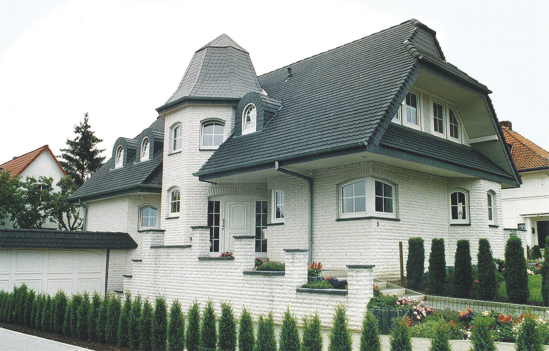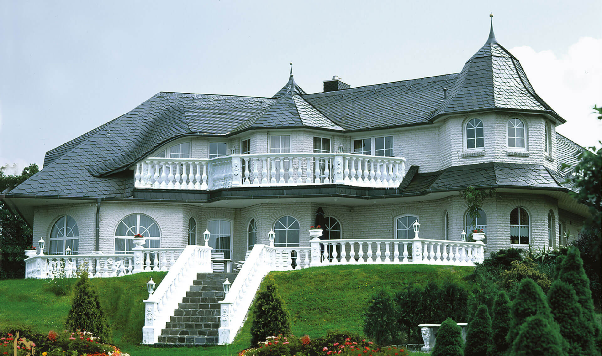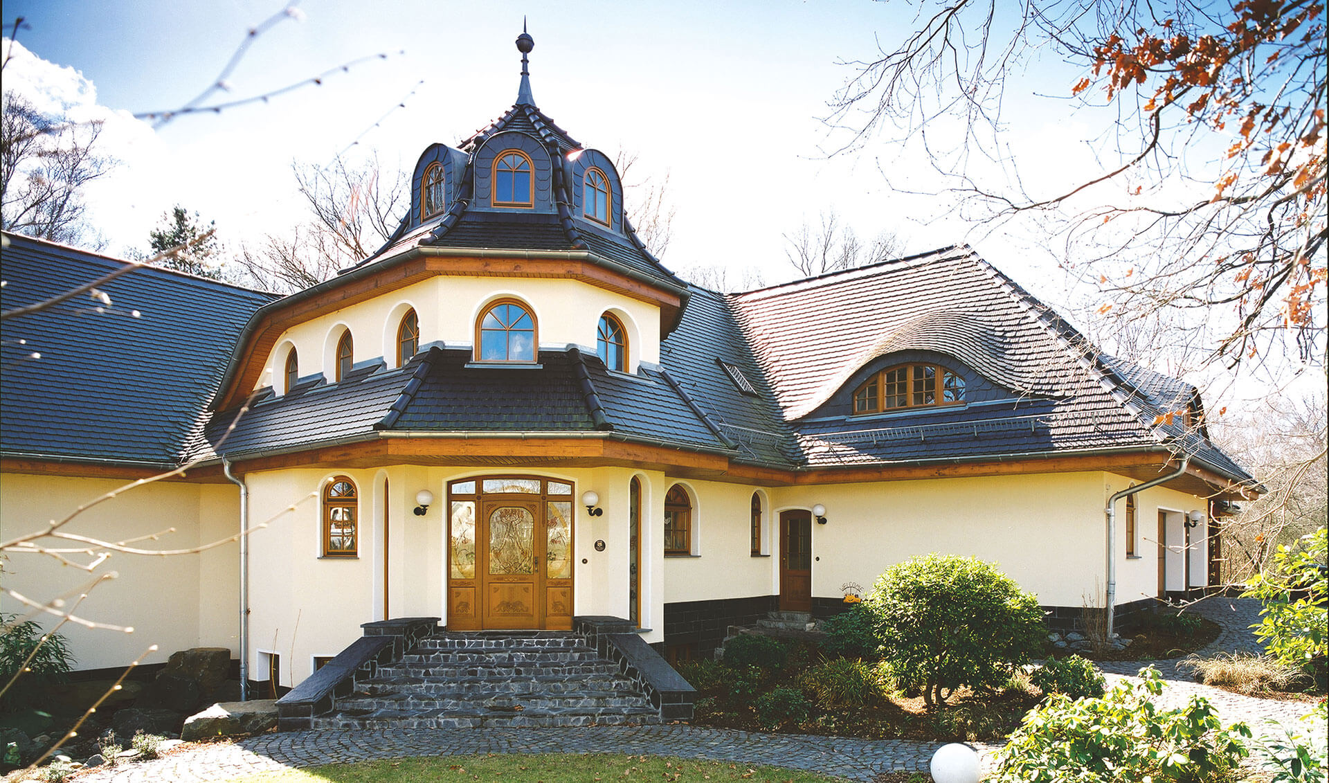 mit dominantem Hauseingangsturm, Ochsenaugen-Gauben und behaglicher, geschützter Loggia im eleganten Kunst-Schieferdach.