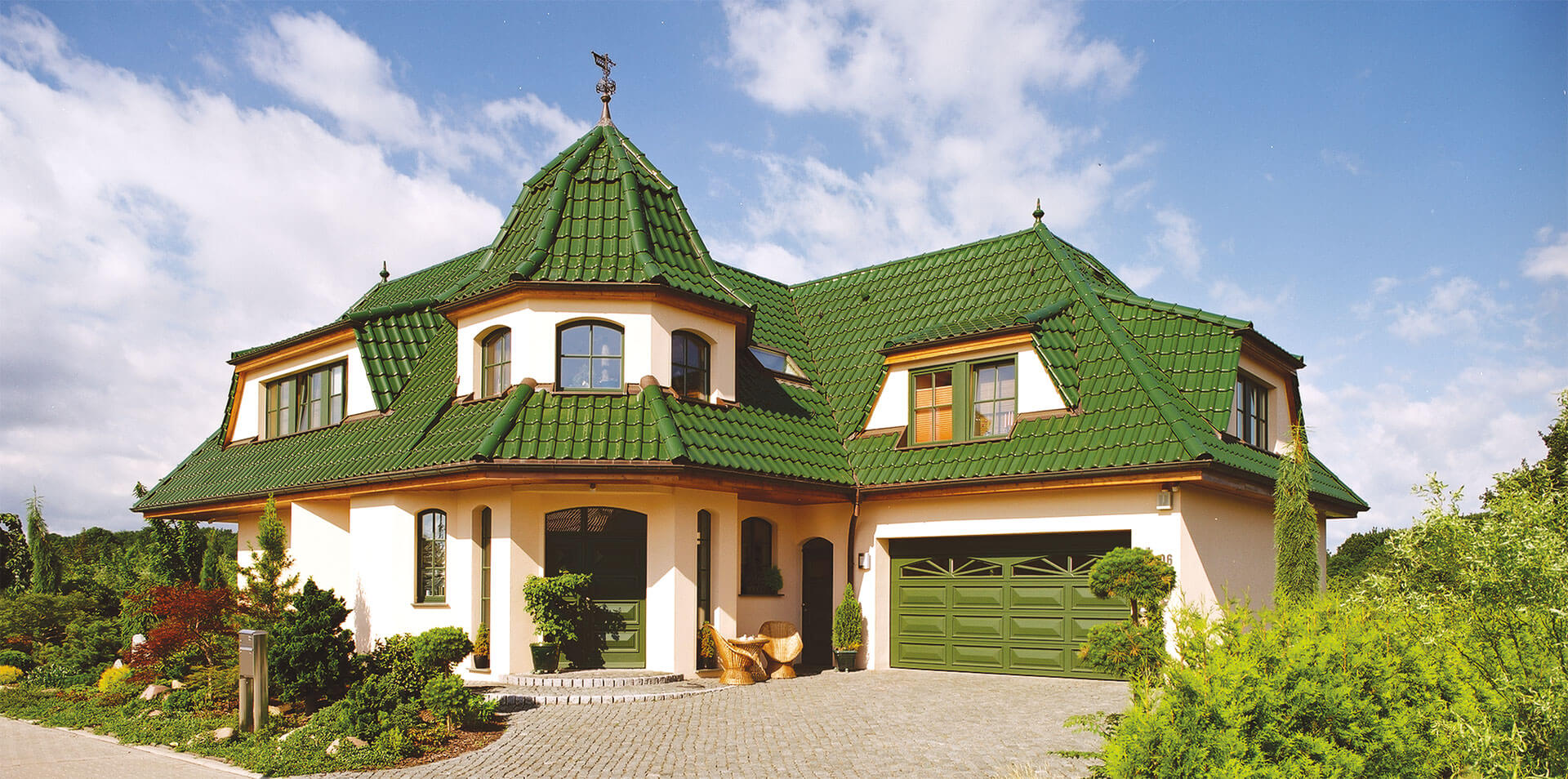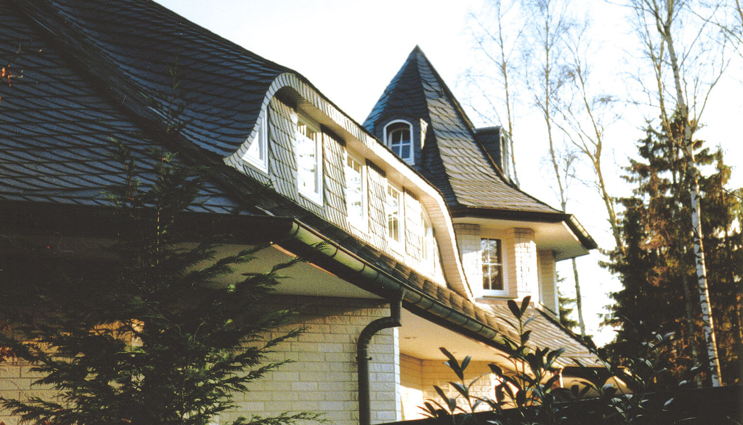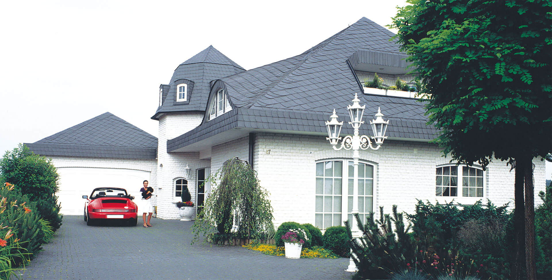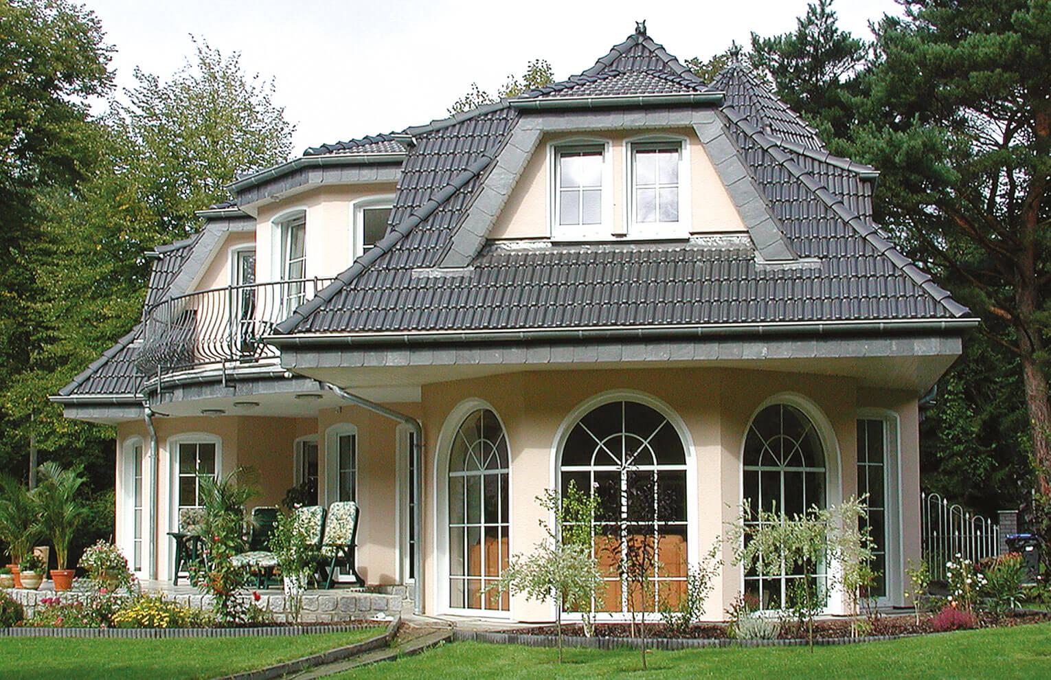 mit dominantem Hauseingangsturm, Ochsenaugen-Gauben und behaglicher, geschützter Loggia im eleganten Kunst-Schieferdach.