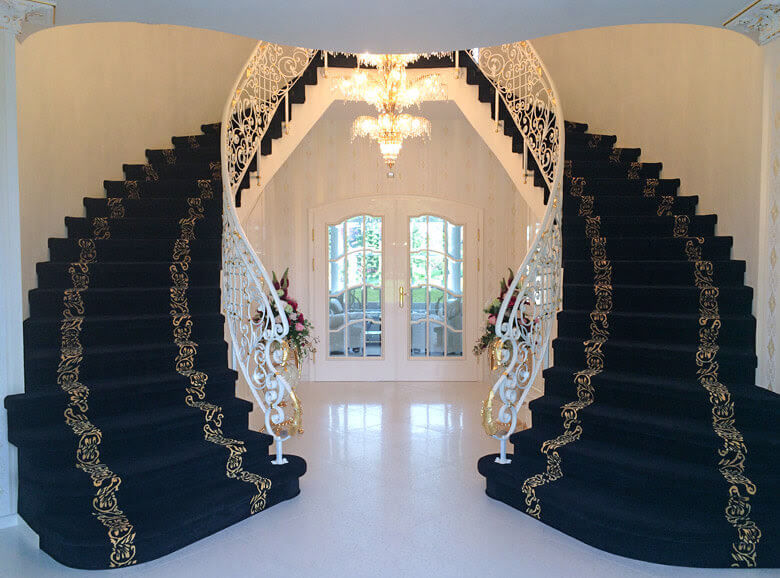 Diese Hoch-Herrschaftliche Doppeltreppe mit "maßgeschneidertem" englischen Teppich und weißem, prunkvollem Kunstschmiedeeisernem Geländer hat unser Architekt ganz individuell für diese exklusive Traum-Villa entworfen und bauen lassen.