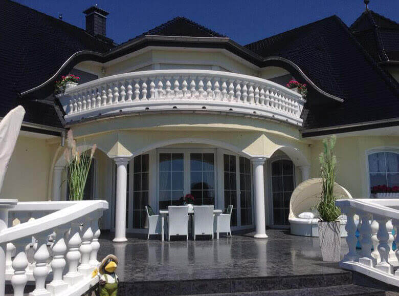 Der runden Balkon schützt die darunterliegende Terrasse vor Sonne und Regen und ist von einem schmiedeeisernen